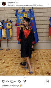 У соцмережах 21-річна Божена Стасів 2 серпня цього року опублікувала допис про закінчення факультету міжнародних відносин у Львівському університеті ім. Івана Франка. А також зазначила, що займається SMM і таргетованою рекламою.