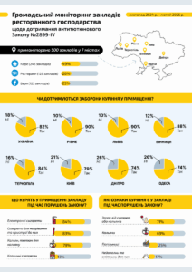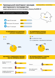 Всеукраїнська кампанія «Молодь вільна від куріння» у партнерстві з Центром громадянського представництва «Життя» представила результати громадського моніторингу 500 кафе, барів та ресторанів у 7 містах: Києві, Львові, Одесі, Дніпрі, Рівному, Вінниці, Тернополі.