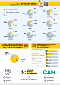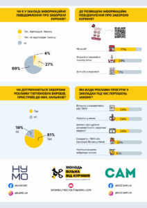 • У 84% закладів ресторанного господарства не було зафіксовано жодної реклами тютюнових виробів, пристроїв для нагрівання тютюну або кальянів. У Львові цей показник складає 81%. Натомість порушниками у Львові найчастіше була використана реклама через вітрини з сигаретами або ТВЕН (54%), дописи у соціальних мережах про куріння кальянів (54%), присутність кальянів у паперовому або електронному меню (54%), присутність сигарет, ТВЕН або пристроїв у паперовому або електронному меню (23%), частина вивіски зображувала кальян (15%).