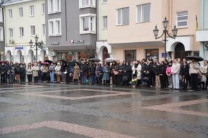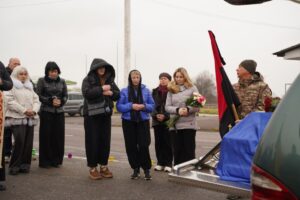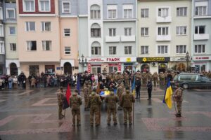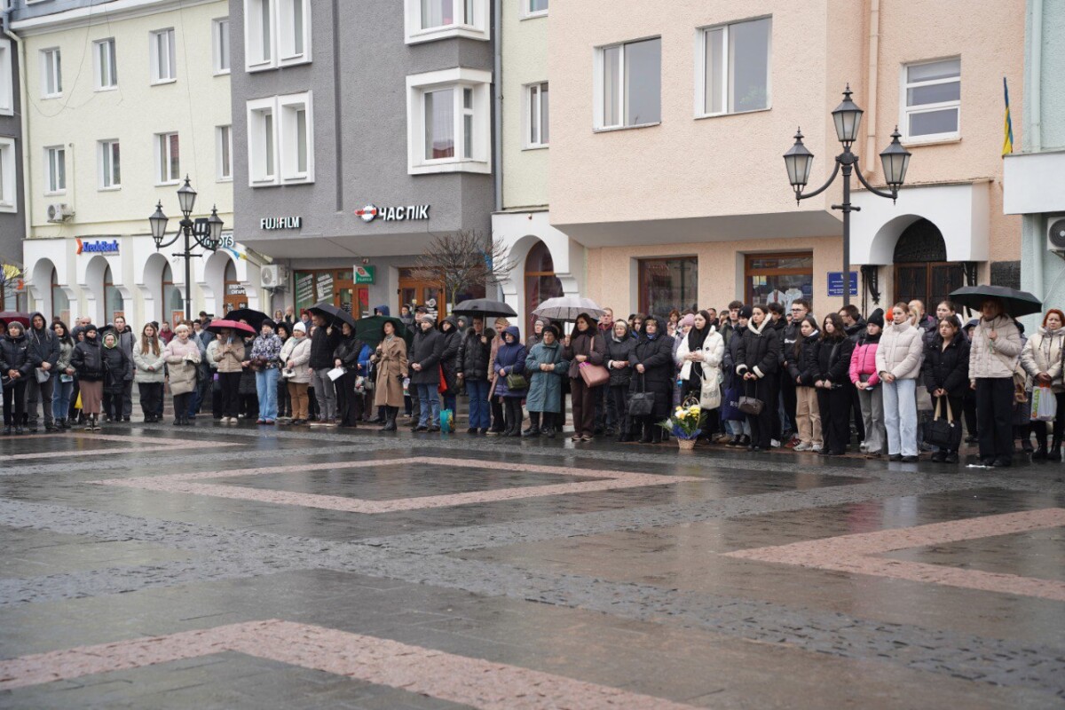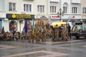 На площі Ринок провели загальноміське прощання за участі рідних, побратимів-нацгвардійців, священнослужителів, керівництва громади та небайдужих мешканців. Присутні спільною молитвою, навколішки, віддали шану воїну, який віддав за рідну країну власне життя.