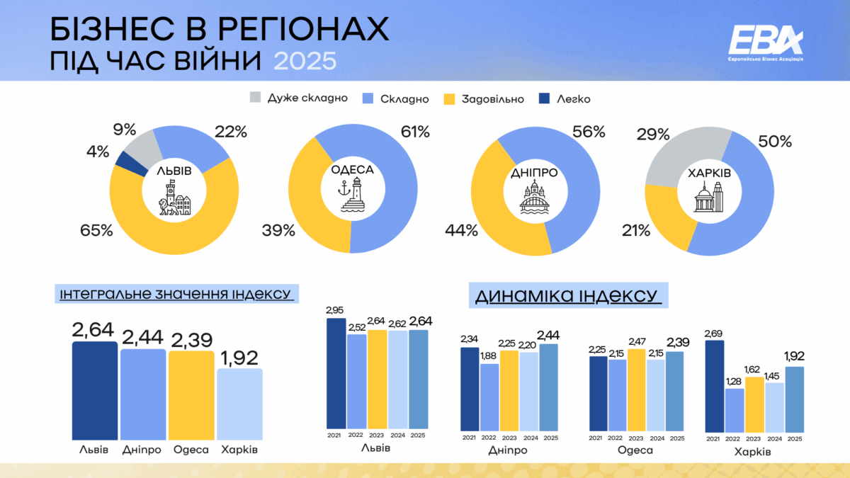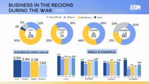 Оцінка бізнес-клімату Західного регіону традиційно лідирує в рамках опитування компаній регіональних офісів Європейської Бізнес Асоціації. Інтегральний показник умов ведення бізнесу склав 2,64 бала у 2025 році з 5-ти можливих, що незнаним чином вище за минулорічний показник (2,62 бала).
