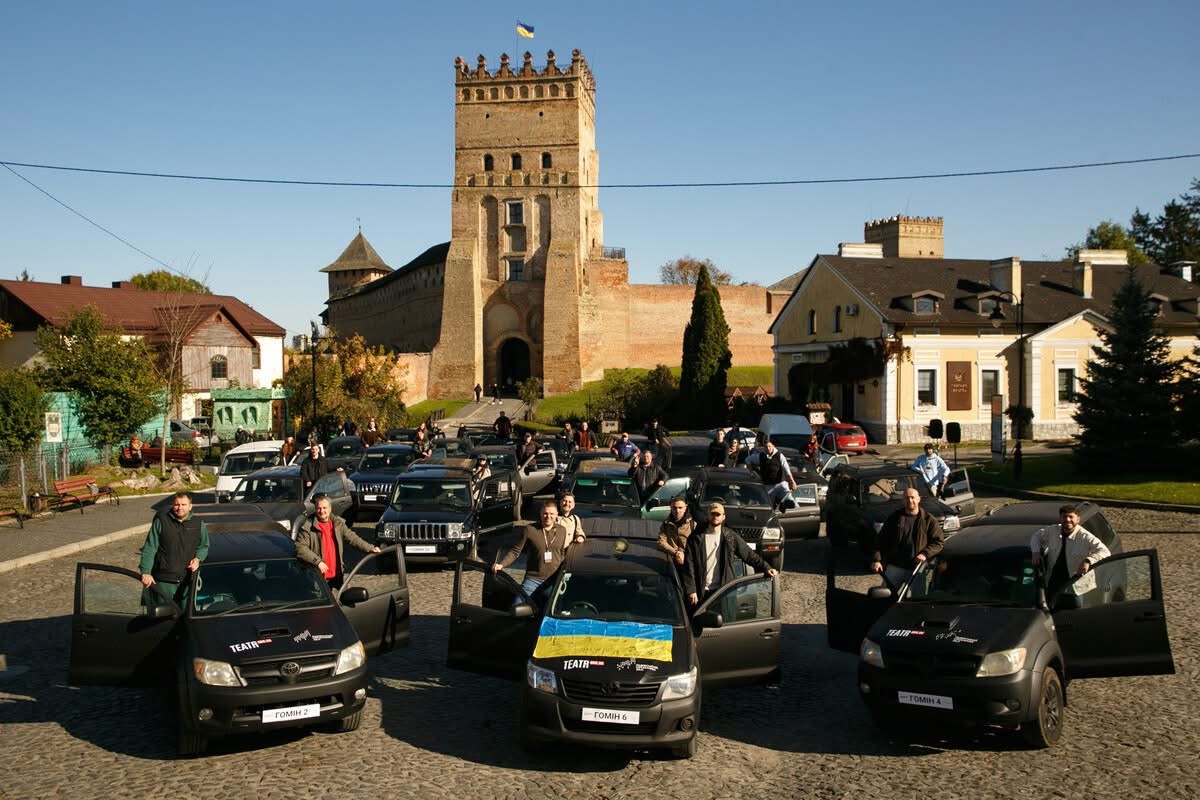 Це перша половина автівок, що вже вдалося закупити, відремонтувати та доправити на передову, завдяки донатам відвідувачів концертів “Гомону”. У планах — ще 25.