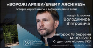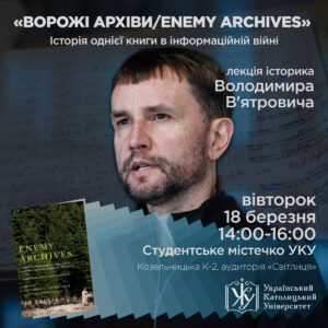 У вівторок, 18 березня, у Львові, у Студентському містечку Українського католицького університету (вул. Козельницька, К-2, аудиторія «Світлиця») історик, автор історичних книг, д-р Володимир В’ятрович прочитає лекцію «Ворожі архіви/Enemy archives. Історія однієї книги в інформаційній війні». Початок лекції – о 14:00.