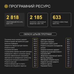 У бюджет заклали 29 цільових програм на 2,818 млрд грн, із них 633 млн грн – на інвестиційні проєкти: модернізація критичних об’єктів, укриття, інфраструктура.