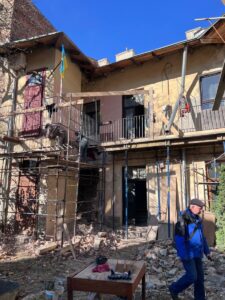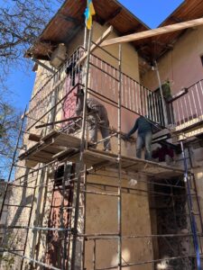 А от на Стороженка, 23 через обстріли зруйнований балкон у дворику. Зараз фахівці працюють над встановленням та зварюванням конструкцій та його відновленням