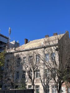 На Шараневича, 8 – робітники замінили деревʼяні конструкції, обрешітку, плівку, ринви. Зараз відновлюють комини та наступний етап – накриватимуть покрівлю