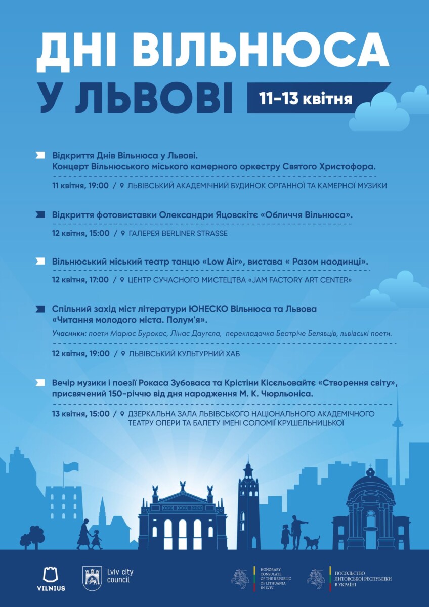 Цими вихідними, 11-13 квітня, Львів прийматиме у себе Дні Вільнюса – в межах культурного обміну відбудеться чимало заходів, спрямованих на побудову міцнішого культурного мостика між Україною та Литвою. У межах програми заплановані концерти, виставки, театральні вистави та поетичні вечори, які розкриють культуру литовської столиці — Вільнюса.