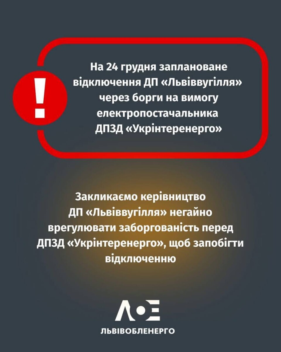 На вимогу електропостачальника, державного підприємства ДПЗД «Укрінтеренерго» (постачальник «останньої надії»), на 24 грудня 2025 року заплановане відключення об’єктів іншого державного підприємства — ДП «Львіввугілля» (об’єкти соціальної сфери, адмінбудівлі тощо), у зв’язку із заборгованістю за спожиту електричну енергію.