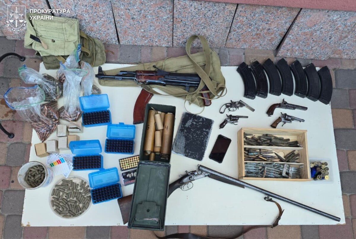 Окрім цього у ході проведених обшуків за місцем його проживання виявлено та вилучено понад 1200 патронів різного калібру, 9 магазинів до автомата Калашникова, 4 револьвери, 4 гранати, рушницю, карабін вибухові пакети та інші речові докази.