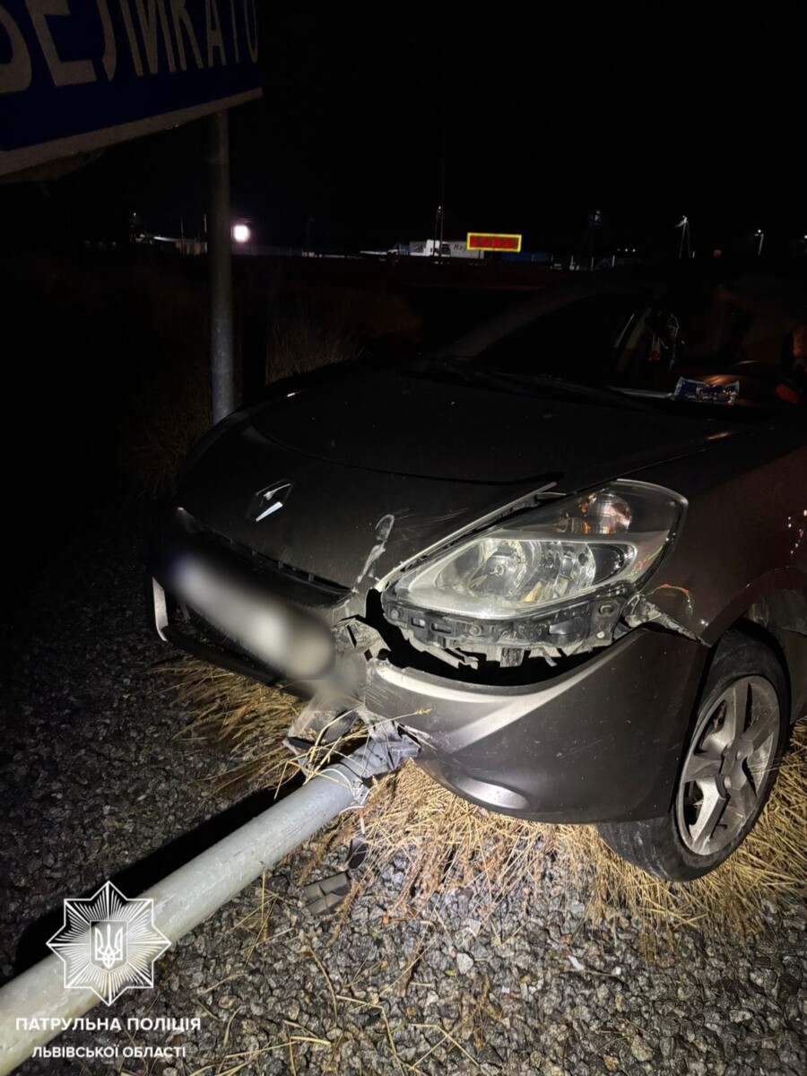 Під час крайньої нічної зміни патрульні натрапили на ДТП у селі Сокільники. Там, водій автомобіля Renault Clio вʼїхав у дорожній знак.
