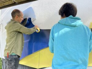 Автором став художник Василь Ремарчук, який розписував стіну в музеї Будинку воїна. «Ми вирішили, що з одного боку будуть портрети Воїнів, які навчалися в спортивній школі й віддали життя за Україну, а з іншого — зображення емблем усіх видів спорту, якими тут займаються діти. Я розробив кілька ескізів, ми обговорили їх з родинами і зупинилися на остаточному варіанті. Якщо дозволить погода, за півтора місяця роботу буде завершено», — поділився Василь Ремарчук.