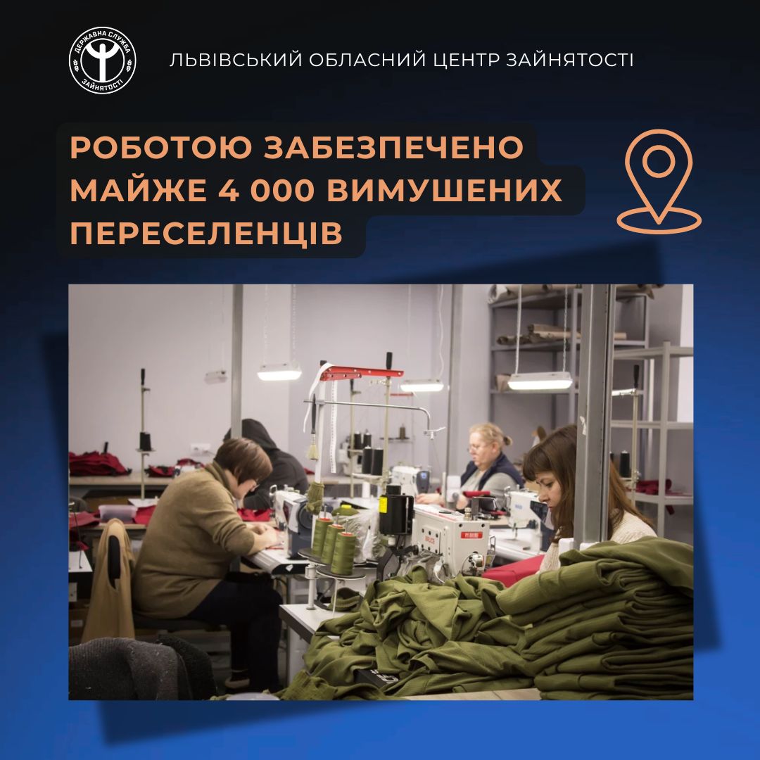 Станом на 01.09.2025 року за сприяння Львівської обласної служби зайнятості роботу шукали 443 безробітних з числа осіб, котрі переїхали в нашу область з районів активного ведення бойових дій або тимчасово окупованих територій. Із них 126 отримували послуги у Львівській філії ЛОЦЗ, 82 – у Стрийській, 69 – у Самбірській, 65 – у Дрогобицькій, 39 – у Золочівській, 32 – у Яворівській, 30 – у Червоноградській філіях ЛОЦЗ.