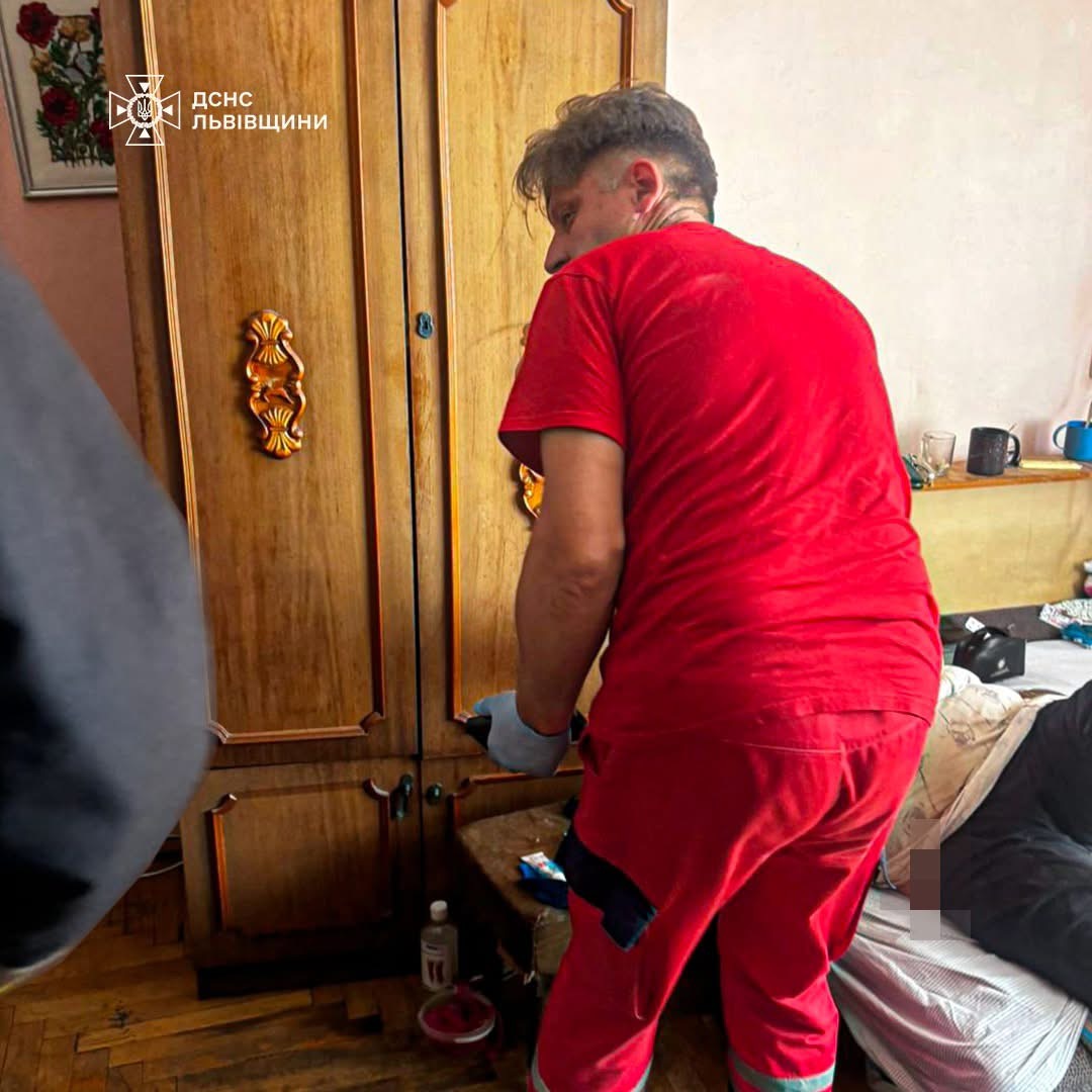 О 10:36 у місті Трускавець мешканка квартири затиснула руку між шафою та ліжком і не могла самостійно вибратися. На місце події прибули рятувальники з 7-ї державної пожежно-рятувальної частини м. Трускавець, які за допомогою спецінструменту Halligan надали доступ медикам і поліцейським, після чого звільнили руку жінки.