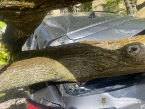 Близько 11:00 на вулиці Тарнавського у Львові вітер повалив дерево, яке впало на автомобіль Ford. Поліцейські виїжджали на місце події – забезпечували нормальний рух транспорту та обмежували доступ до ділянки, де під час падіння дерева також були пошкоджені лінії електропередач.