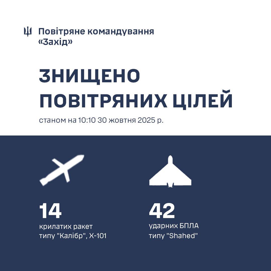 Підрозділи протиповітряної оборони та авіація повітряного командування «Захід» в зоні своєї відповідальності знищили 14 крилатих ракет та 42 ударних БпЛА типу «Shahed».