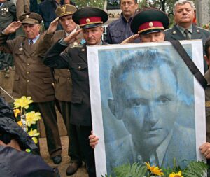 FILE Ветерани УПА та офіцери ЗСУ на могилі останнього головнокомандувача УПА генерала-хорунжого Василя Кука під час похоронів, в селі Красне (Львівська обл.) у вівторок, 11 вересня 2007 р. 9 вересня 2007 р. на 95-році життя Василь Кук помер в Києві у власній квартирі. Фото Віктора Гурняка / УНІАН