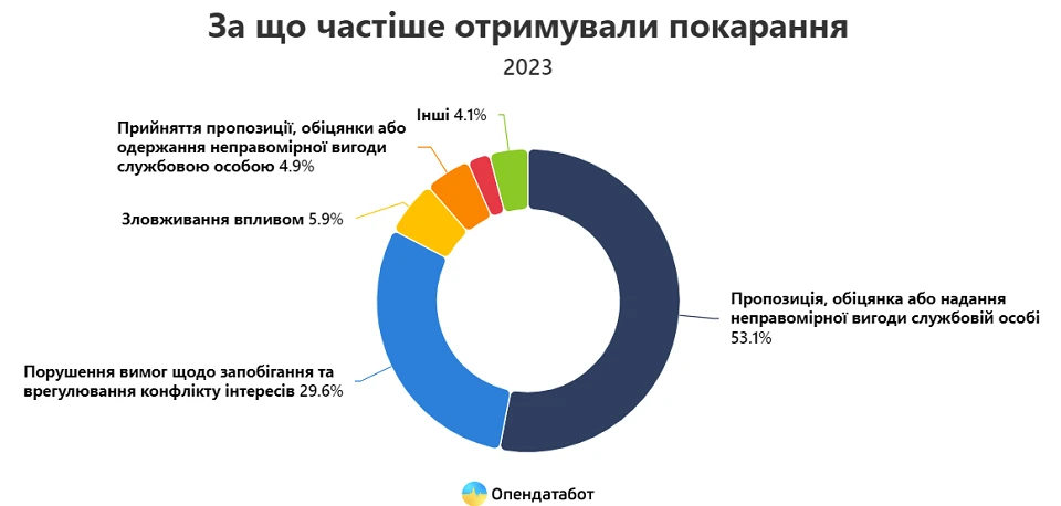 Найчастіше корупціонерів карали за неправомірну вигоду, конфілкт інтересів і зловживання впливом. Зловмисників переважно засуджують до штрафів – 92% вироків. Позбавлення волі та громадські роботи або ж іспитовий строк загалом становлять близько 5-8% покарань.