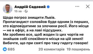 Мер Львова Андрій Садовий прокоментував слова пропагандиста Соловйова.
