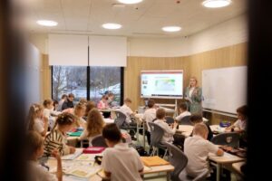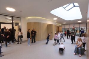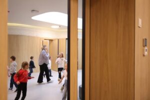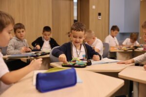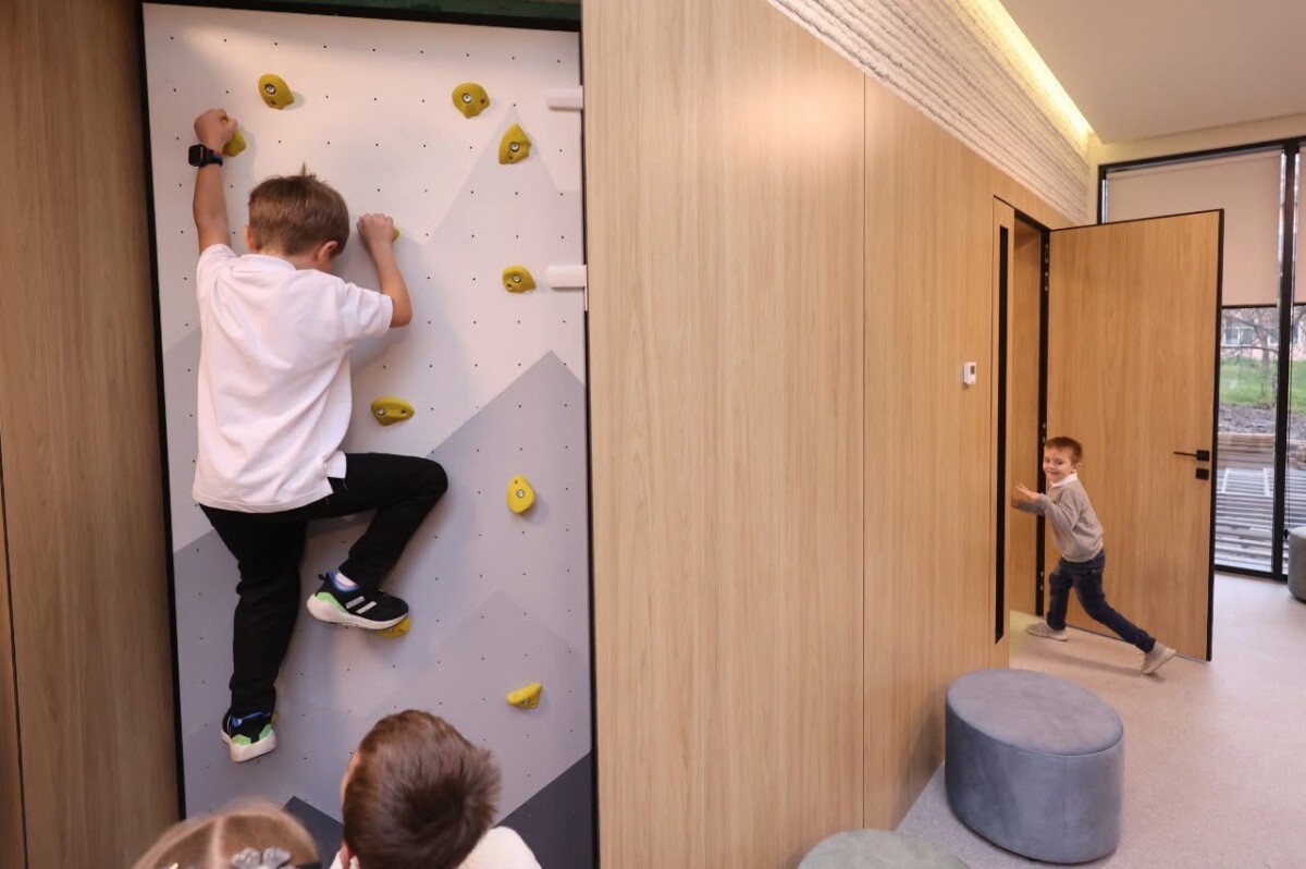 У корпусі просторо й світло завдяки панорамним вікнам, утепленій підлозі та продуманому зонуванню. Тут — сучасні меблі приємних відтінків, зручні вбиральні, окрема учительська, а також просторий хол із невеличким скеледромом. Будівля повністю інклюзивна та обладнана всім необхідним для комфортного навчального процесу.
