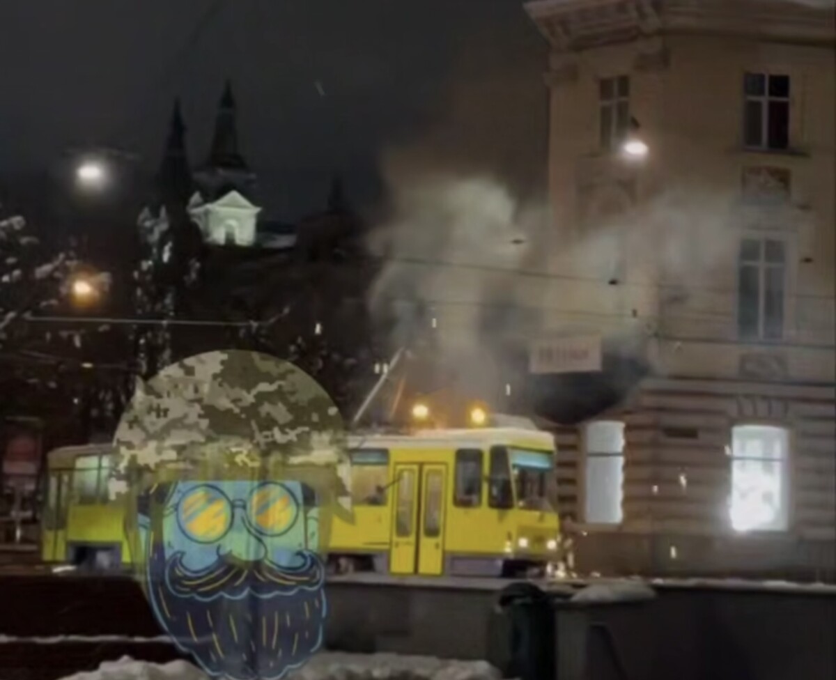 На площі Митній знову горить трамвай. Люди намагаються загасити пожежу снігом.