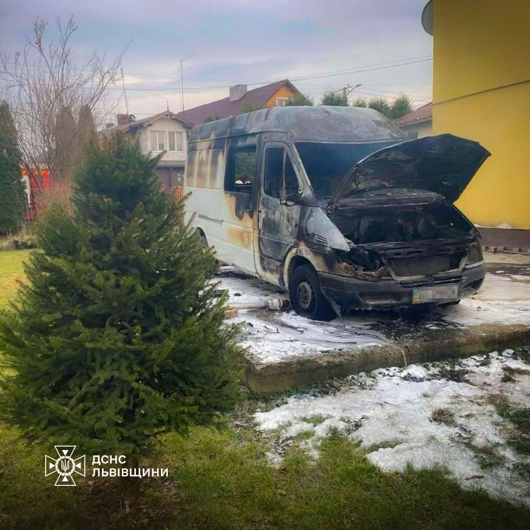 Транспортний засіб стояв припаркований на подвір’ї. Займання виникло в моторному відсіку мікроавтобуса та швидко поширилось на салон.