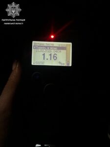 У 20-річного водія поліцейські виявили ознаки алкогольного спʼяніння. Перевірка на пристрої Драгер показала результат 1,16 проміле.
