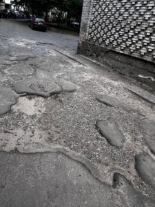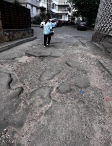 Глибокі вибоїни, відсутність дорожнього покриття. Таксисти відмовляються заїжджати у двір. А пішоходам після дощу не можливо пройти бо у тих ямах довго стоїть вода, тротуар відсутній.
