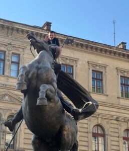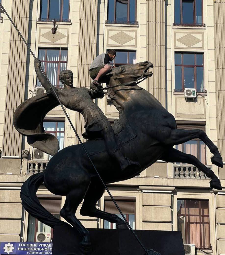 “Дивовижна транспортна новина! У Львові любитель верхової їзди видерся на пам’ятник Змієборцю щоб проїхатись на його коні. Довго поїздити не вийшло, бо це було під вікнами головного управління поліції і стражі закону не оцінили таке небезпечне керування. Цікаво чи притягнуть по 130 статті, але відмінку точно пішли оформляти. Комедія в трьох фото”, – йдеться у повідомленні.