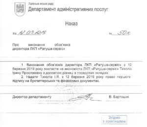 У статусі підозрюваної, як вбачається з ухвали, фігурує виконувачка обов’язків директора Львівського комунального підприємства «Ратуша-сервіс», яка обіймала вказану посаду відповідно до наказу Департаменту адміністративних послуг Львівської міської ради № 50к від 12.03.2019. Leopolis.news з’ясував: мова йде про наказ, згідно з яким виконання обов’язків директора ЛКП «Ратуша-сервіс» з 12 березня 2012 року було покладено на економіста даного підприємства Тихоліз Ірину Ярославівну.