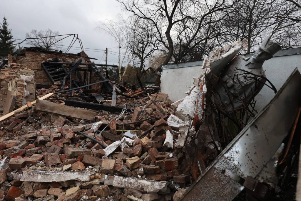 За моєю спиною руїни музею Романа Шухевича. Знищений московською ордою музей, який був місцем, де прийняв свою останню битву генерал-хорунжий УПА.
