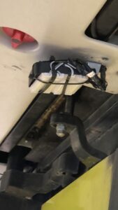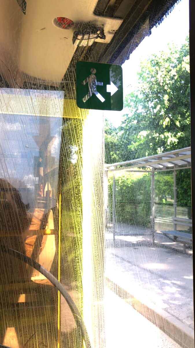 Зад має розбите вікно, яке не дай Бог посипиться на когось із пасажирів. Над дверям перемотаний датчик для освітлення. Також по стані чистоти, дуже брудні двері.