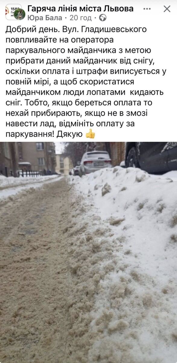 На час снігового колапсу на паркувальних ділянках, які не розчищаються комунальними силами, оплата за паркування має бути скасоване.