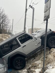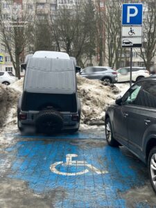 Сьогодні на зупинці одного із торгових центрів на вулиці Кульпарківській ми помітили авто Jeep Wrangler, керманич якого здійснив зупинку на місці для людей з інвалідністю, припаркувавшись на сніговій кучугурі.