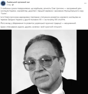 Про втрату у культурній сфері України повідомив Львівський органний зал у Facebook.