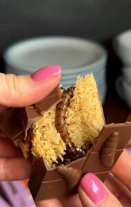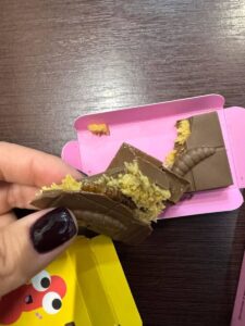 Це темний шоколад з личинками зофобоса, смаженим тістом катаїфі і арахісовою пастою.