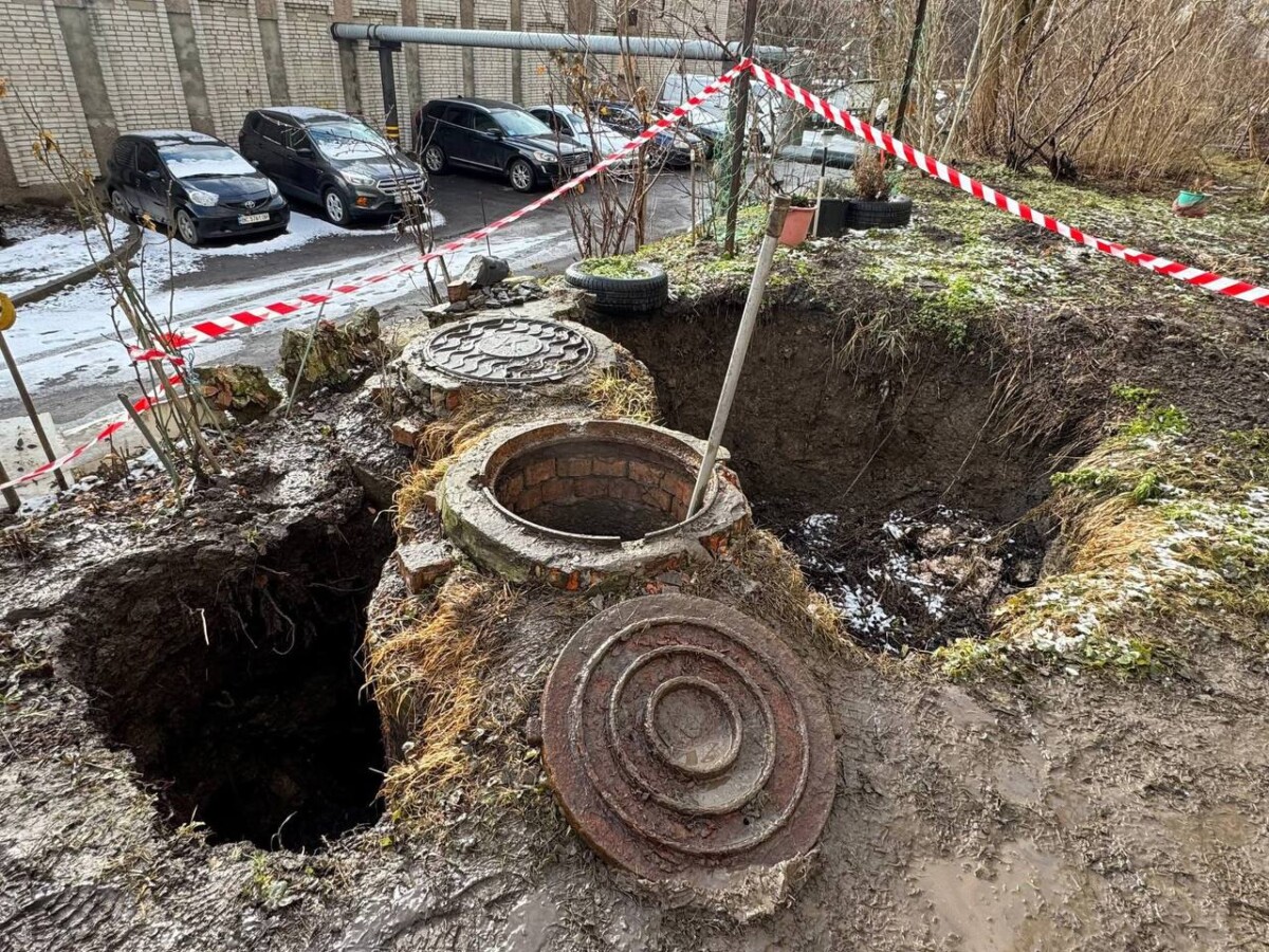 Через засмічення стоки не могли нормально відводитися, що призвело до руйнування каналізаційного колодязя. Ситуацію ускладнили рясні опади снігу: через перепад висоти між будинками вода додатково підмивала ґрунт.