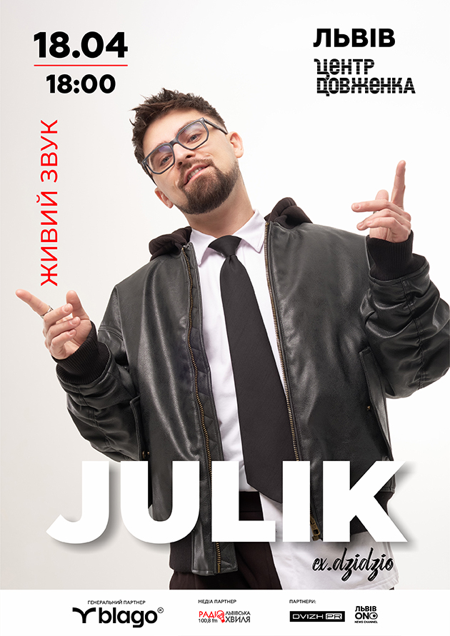 У суботу, 18 квітня, у Львові — в Центрі Довженка, що на Сихові, — відбудеться перший великий сольний концерт співака Юліка, колишнього учасника гурту DZIDZIO. Початок – о 18:00.