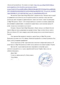 Наприкінці звернення шеф-редакторка ІА «Центр новин» Ольга Витак зазначила: «Також звертаємось до Вас із проханням щодо можливого повернення (оренди на 50 років) храму св. Марії Магдалини релігійній громаді Римсько-Католицької Церкви в Україні. Просимо надати відповідь на це звернення на електронну адресу centernewsua@gmail.com у термін, передбачений Законом України “Про доступ до публічної інформації”».