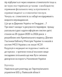 Бо поки що у м. Львові стоматологи беруть ніби хабарі: безготівковий розрахунок за надані стоматпослуги не організований, затверджених розцінок їх послуг біля стоматкабінетів не існує в публічному доступі згідно ЗУ “Про доступ до публічної інформації” та профільних Постанов Кабінету Міністрів України з медичних питань