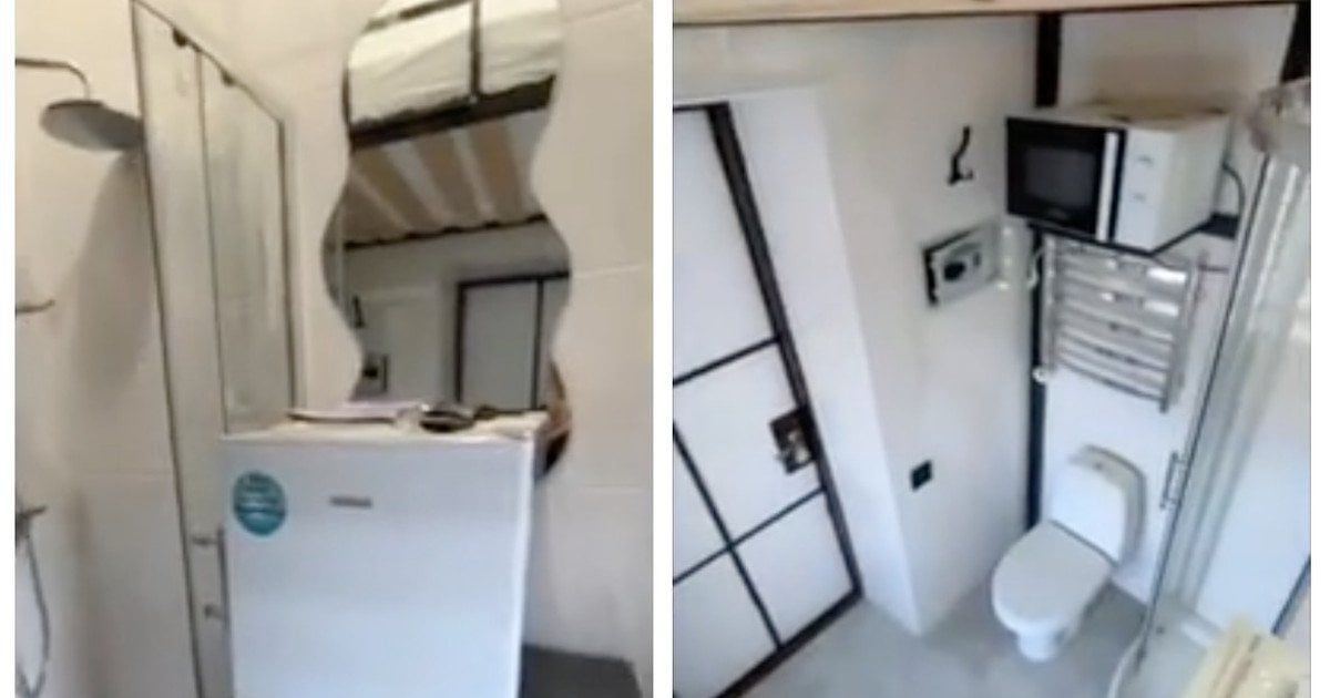 Через те, що площа квартири становить лише 4 кв. м, власники об’єднали санвузол і спальне місце в один простір, а кухні тут узагалі немає. Ліжко розміщене на другому ярусі, а мікрохвильову піч розташували просто над унітазом.