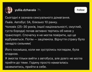 Дівчина пише, що якийсь невідомий збоченець терся об неї у транспорті близько 10 ранку. Чоловік (25-30 років, іншої національності, смуглий, густа борода).