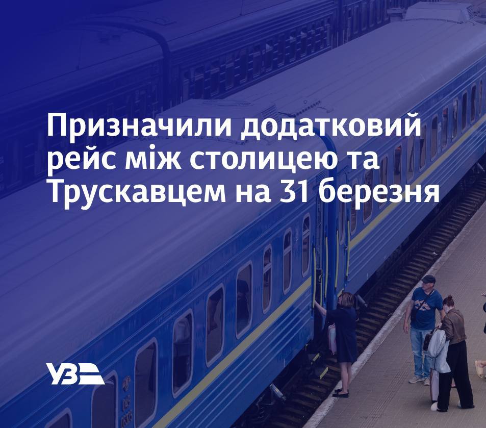 31 березня з Києва до Трускавця вирушить додатковий поїзд №159/160. Він відправляється з Києва о 10:16 і прибуває до Трускавця о 19:37.
