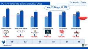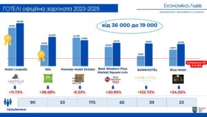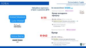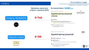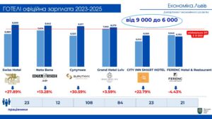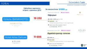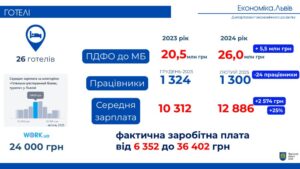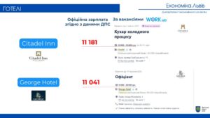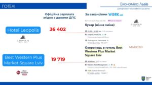 У Львівській міській раді проаналізували рівень зарплат, які виплачують працівникам 26 найбільших готелів міста. За даними work.ua середня заробітна плата в готельному секторі становить 24 тисячі гривень. Зокрема, лише в двох готелях міста Leopolis та Ibis рівень зарплати є вищим ніж у запропонованих вакансіях. Ці готелі відзначили нагородою як соціально-відповідальний бізнес міста.