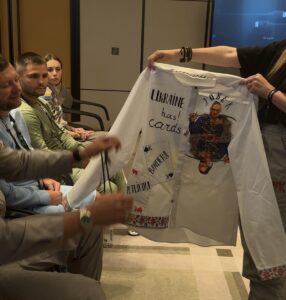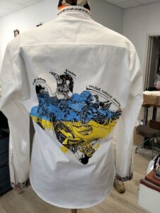 Відома українська дизайнерка Оксана Караванська створила унікальну сорочку для Олександра Усика і передала її боксеру в подарунок у Лондоні у суботу, 19 липня, за лічені години перед матчем-реваншем Усик – Дюбуа. “Десь я в ній з’явлюся”, – відповів Сашко, із захопленням роздивляючись оригінальний презент! Вишита та розписана вручну дизайнерська сорочка з оригінальним змістом – це про віру в перемогу і в Українських героїв.