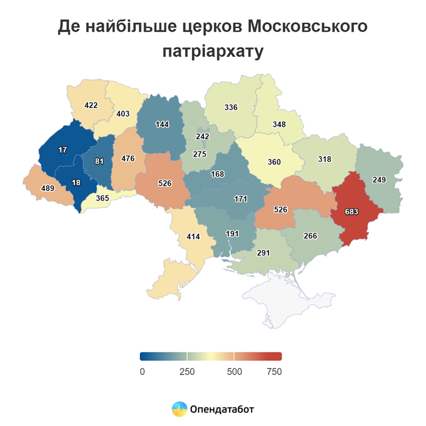 Натомість досі 8 097 церков в Україні пов’язані з країною-агресором. Найбільше таких релігійних установ на Донеччині — 683 громади. Далі йдуть Дніпропетровська та Вінницька області — по 526 церков на кожну.