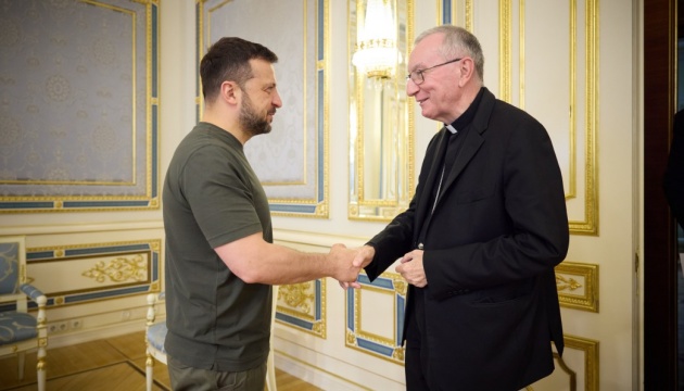 Президент України Володимир Зеленський під час зустрічі у Києві із державним секретарем Ватикану кардиналом Пʼєтро Пароліном обговорив наслідки російської агресії, повітряний терор та результати Саміту миру.