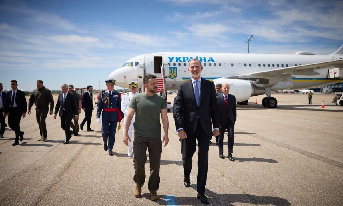 Літак із президентом України приземлився в аеропорту Мадрид-Барахас. Володимира Зеленського особисто зустрів король Іспанії Феліпе VI. Відео зустрічі було оприлюднено на офіційних сторінках соцмереж глави держави.